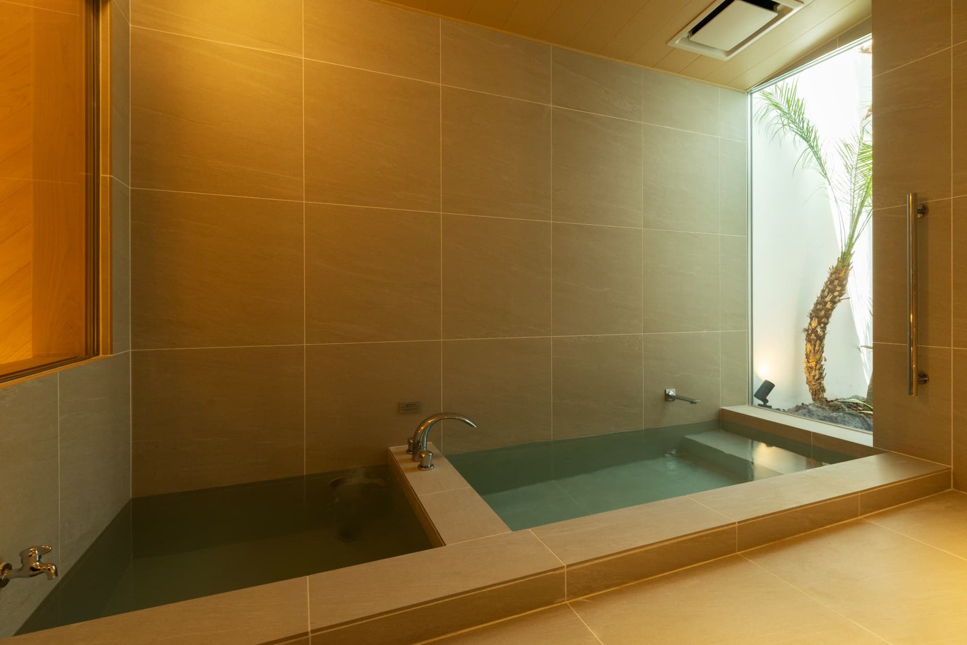 温泉は、かの万葉集にも詠われた名湯の誉れ高い、地元「湯河原温泉」を当施設のため特別配送しています。また、セルフロウリュもできるプライベートサウナもあり、究極のととのい体験を提供します。