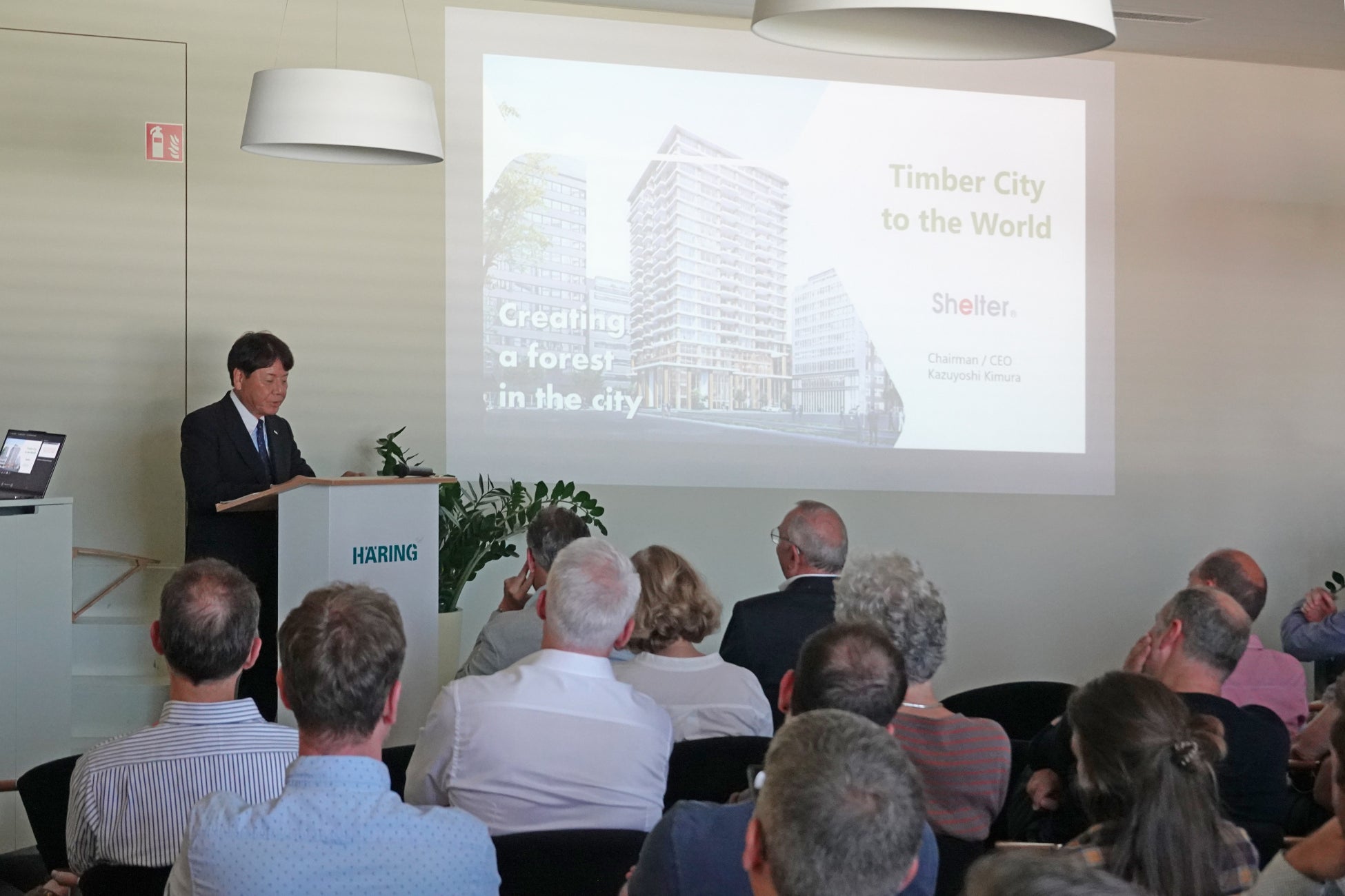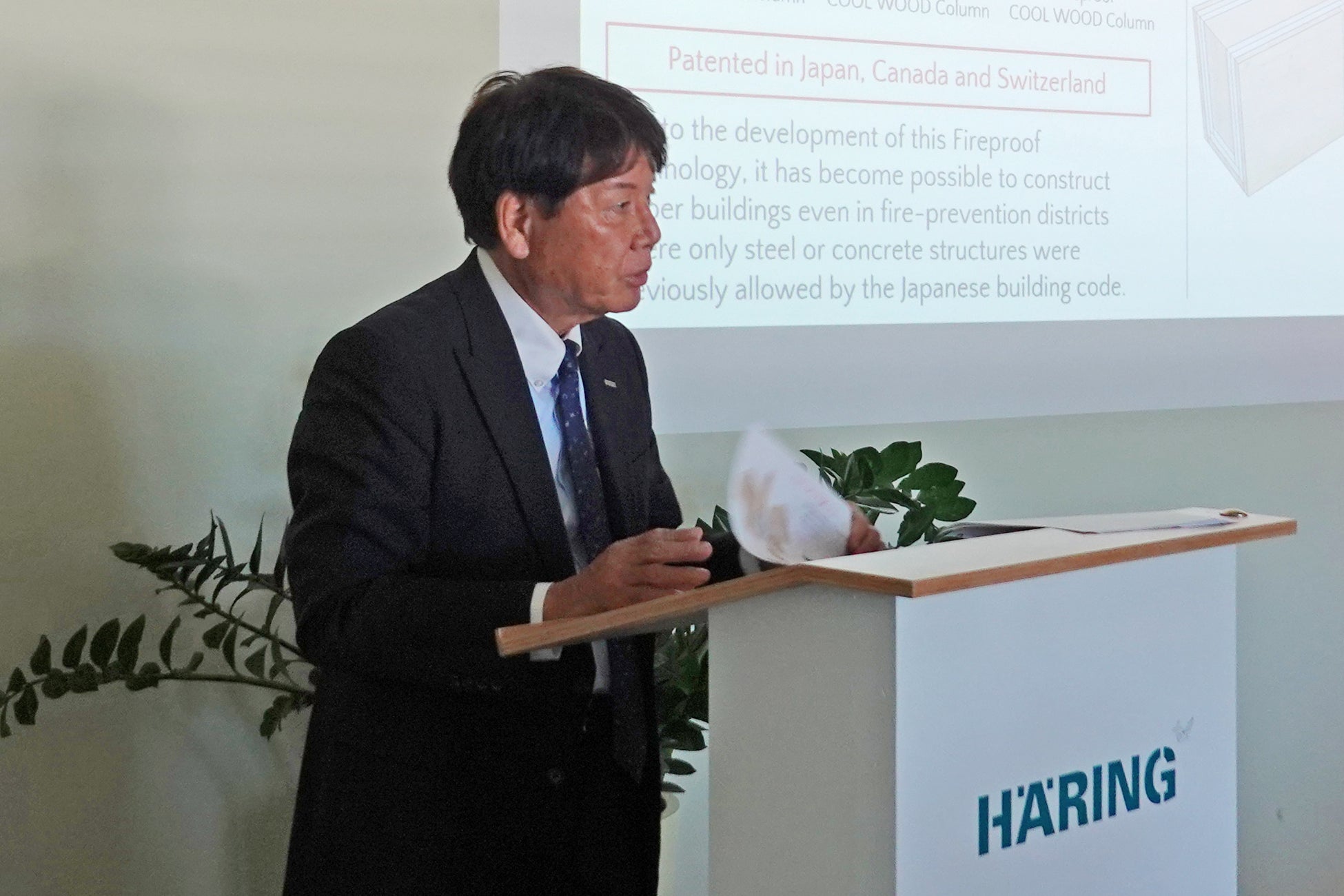 講演では、独自のKES構法、COOL WOODの技術を紹介し、このような木造の構築技術、耐火技術によって、日本で多くの木造高層ビルの建築を可能にしていることを示しました。