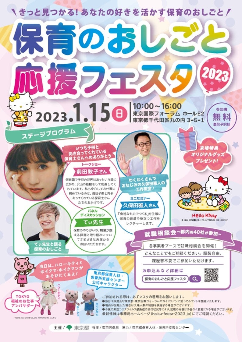 そこで、今年度も、「保育のおしごと応援フェスタ2023」として、現役保育士の方はもちろん、潜在保育士の方や保育士を目指す学生さんなど、保育の仕事に興味・関心をお持ちの全ての皆さんを対象としたイベントを開催します。いつも頼りになる保育士さんへの感謝のメッセージを伝えるトークショーやパネルディスカッションなど、保育の魅力を発信する各種プログラムのほか、これから保育所等に就労をお考えの方のために、都内40社の保育事業者が集まる就職相談会も実施します。