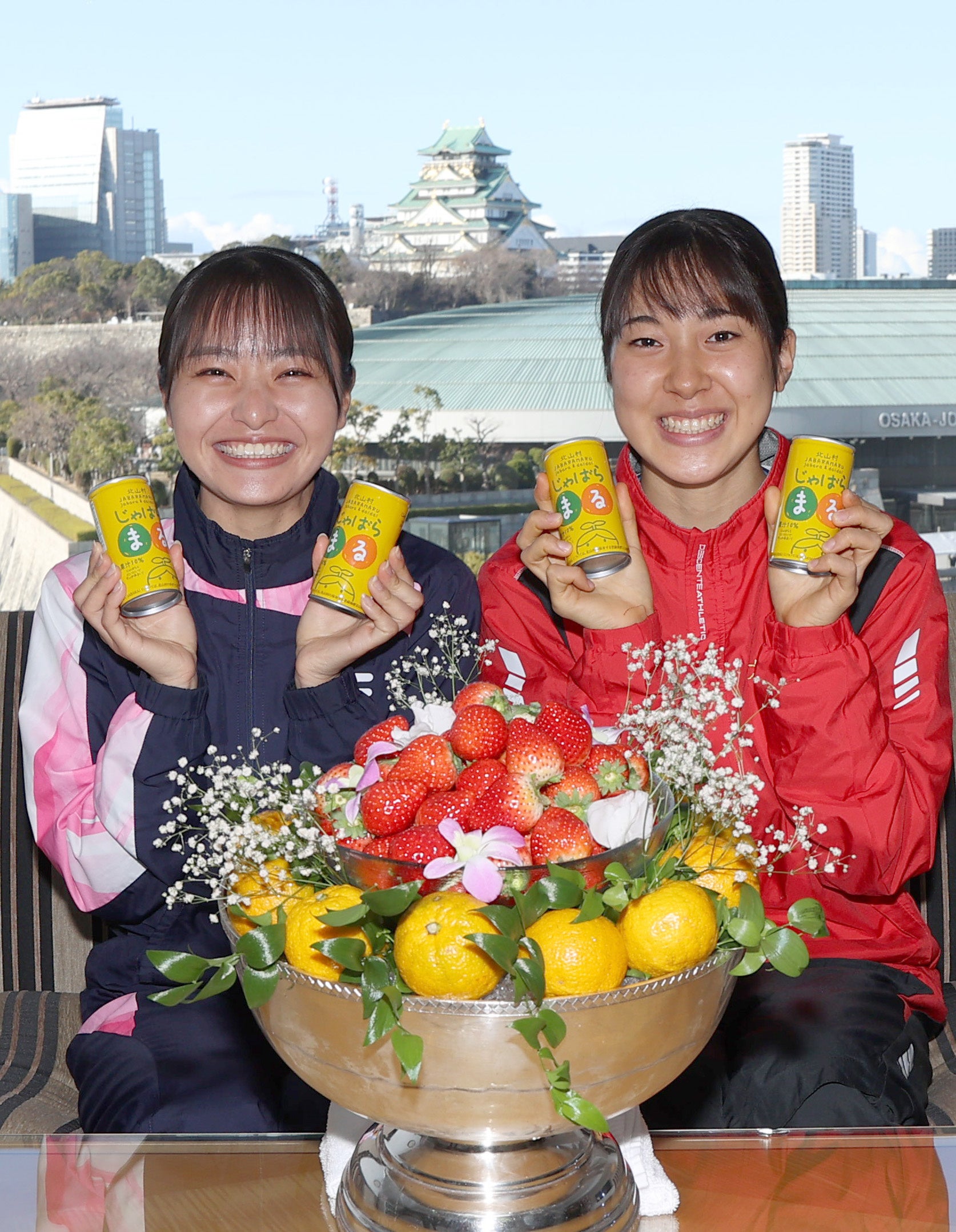 選手村では、大会独自の育成枠「ネクストヒロイン」の矢尾桃子選手と古賀華実選手に商品を手に取っていただき記念撮影も行いました。