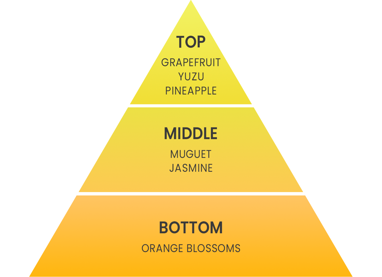 オレンジやグレープフルーツなど爽やかなシトラスを主役に、ミューゲ、ローズ、オレンジブロッサムなどの花々を散りばめました。明るく躍動感のあるシトラス・フローラルの香りです。