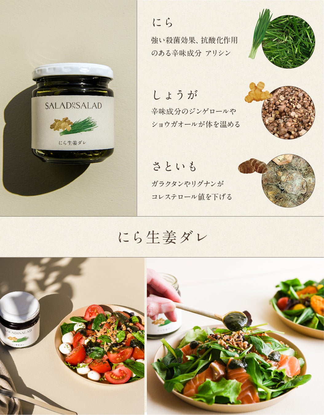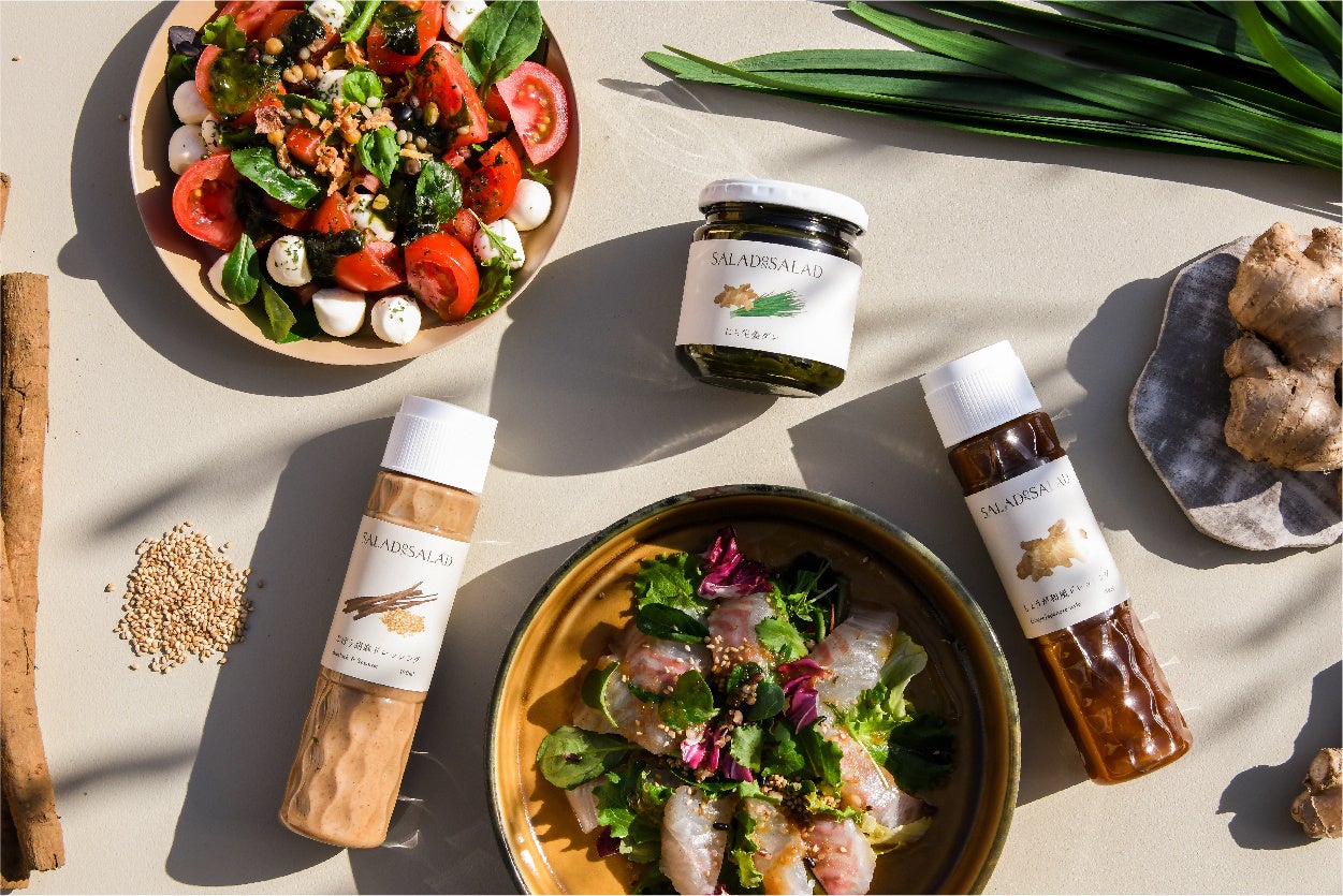 Salad on Salad はいつものサラダをもっと手軽に、栄養をアップできる新しい調味料です。定番の調味料に野菜を足すことで、野菜の風味を感じることができるだけでなく、食物繊維やビタミン、ミネラルといった野菜の栄養も摂ることができます。