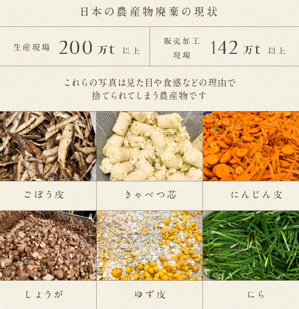 日本国内では毎年多くの農産物が、色や形、食感などを理由に廃棄されています。生産現場では規格外や価格の調整によって200万トン以上が廃棄され、食品加工や流通、販売においても大量の廃棄が問題になっております。本来食べられるはずの食品を廃棄するフードロスは、企業に経済的な損失を与えるだけでなく、エネルギーの無益な消費や温室効果ガスの発生など環境にも悪影響を及ぼしているのです。