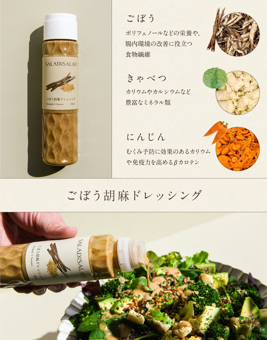 これらの野菜たちは栄養豊富なだけではありません。野菜の旨みで、ドレッシングをさらに美味しく、トロッとした濃厚なドレッシングに仕上げました。口に入れると、ごぼうと胡麻の豊かな香りが広がるのが特徴です。