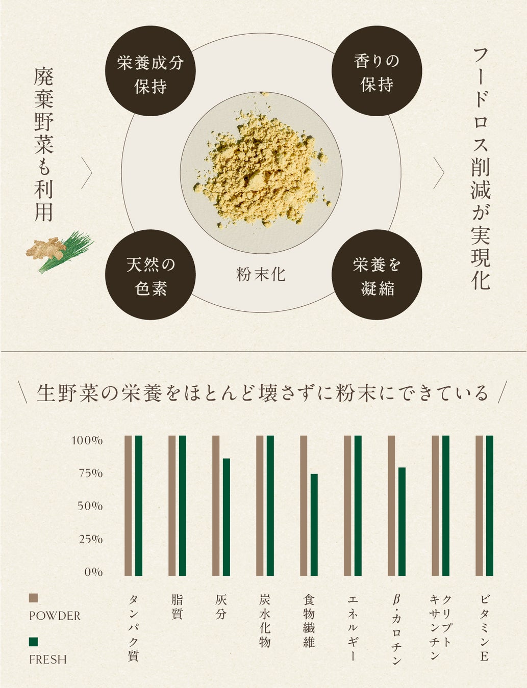 野菜にはあらゆるビタミン、ミネラル、ファイトケミカルが含まれていますが、野菜の約 90%は水分なのです。これを短時間・低温加熱で粉末化することによって水分を飛ばし、野菜の栄養をぎゅっと濃縮したのが、私たちのつくる野菜粉末です。 粉末にすることで、100g の野菜はわずか 10g に濃縮されます。もちろん、もともとの野菜のような味や香りを残しています。実際に、研究の結果として、粉末のほとんどの栄養成分(タンパク質、ビタミン、ミネラル)は、生野菜の 70% 程度保持されていることが明らかになっています。