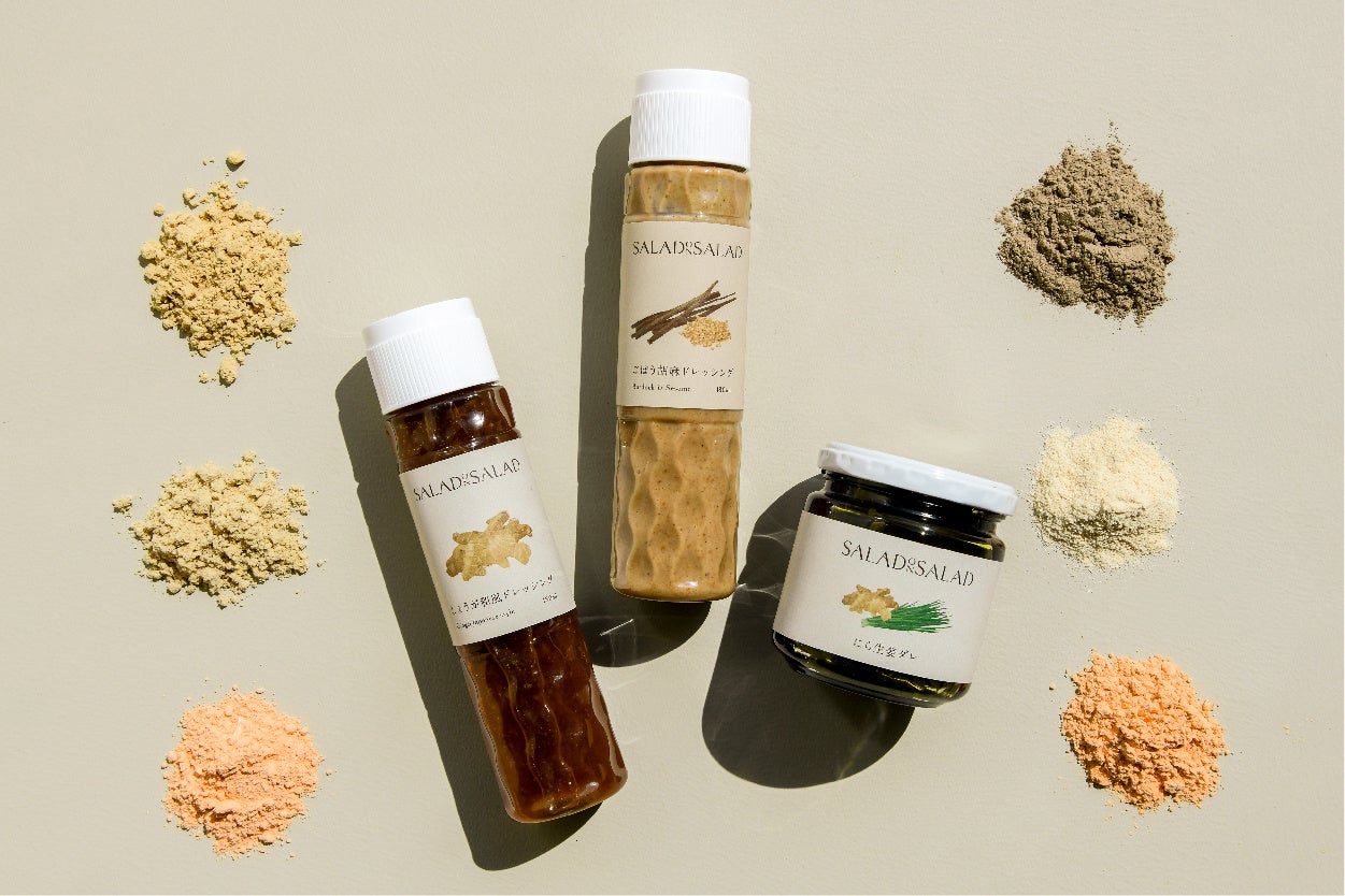 次に、子供から大人まで楽しめる胡麻ドレッシング。胡麻ドレッシングにはゴボウとニンジン、キャベツを粉末状にして混ぜることで、栄養と旨みをたっぷりにしました。