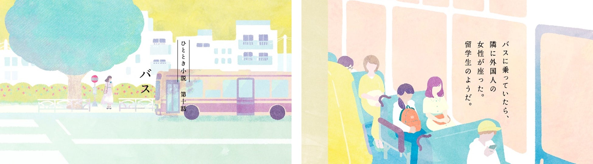 とあるバスで出会った外国人の女性。うとうとしてあくびをすると、となりの彼女もあくびをしていた。言葉は通じなくても“あくびはうつる”。そんなことが通じ合ったかのように笑い合う、そんな幸せのひとときをイラストレーターの宮下和さんが表現しました。