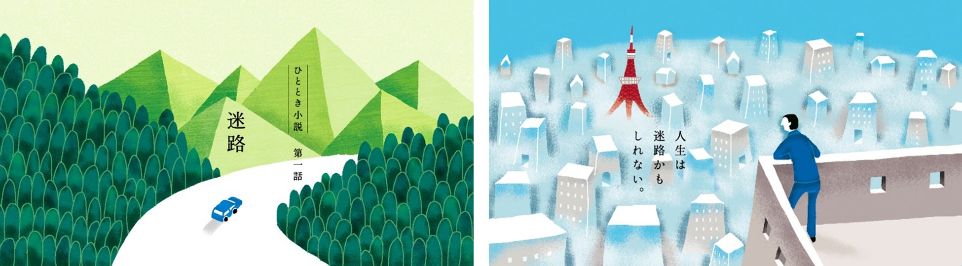 屋上で“人生は迷路かもしれない”と自分に自信をなくし悩む会社員が、先輩から“迷ったときは選んだほうが正解だ”と言われるひとときを、イラストレーターのなかむら葉子さんが繊細なタッチのイラストで表現しました。
