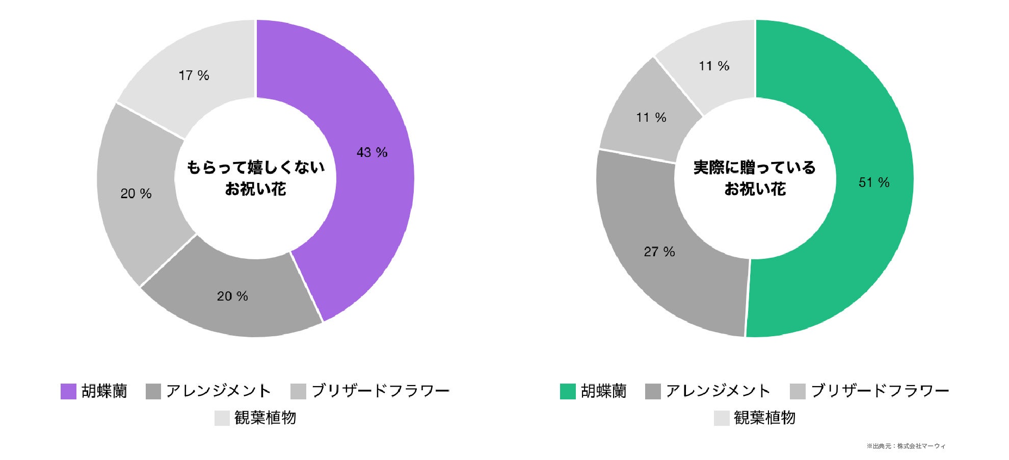 貰う側としては胡蝶蘭を嬉しくないと感じる人が多い中で、贈る側としては胡蝶蘭を選んでいるという貰い手と贈り手にギャップが表れる結果となっています。