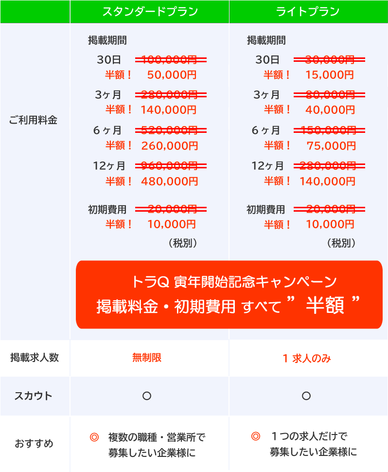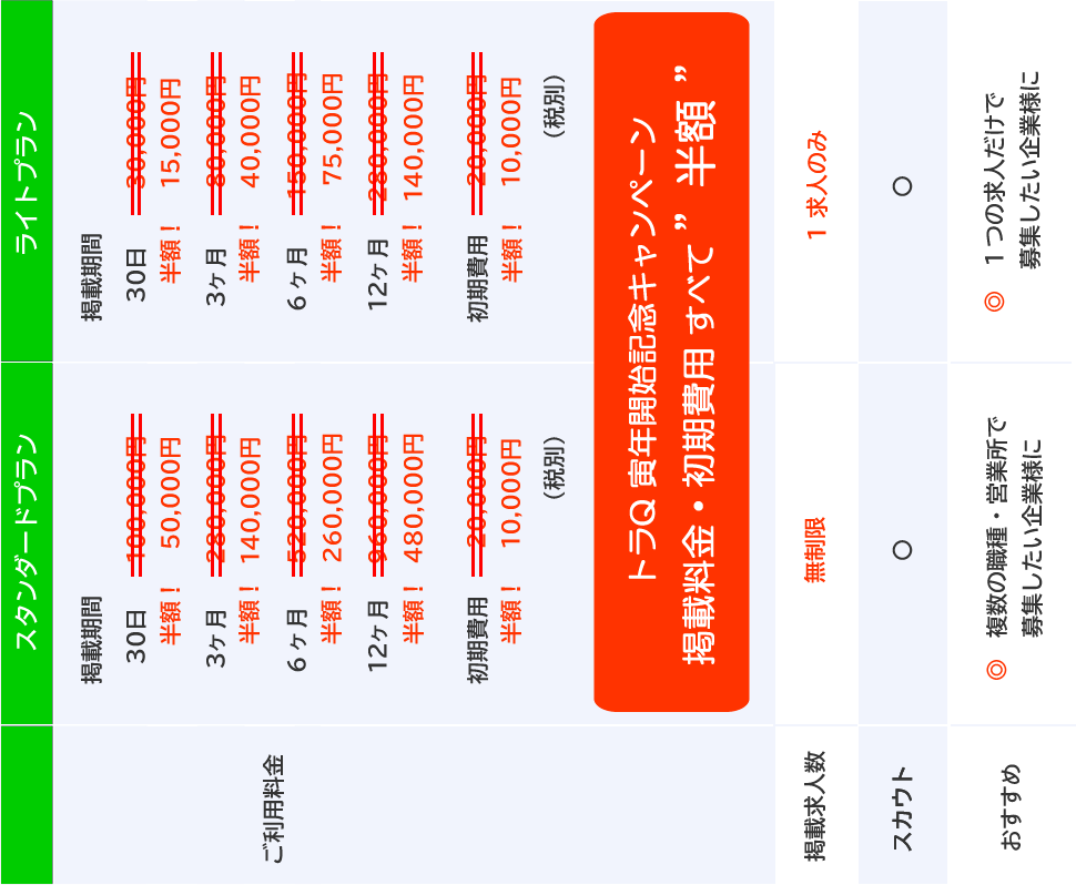 2022年12月31日までに、株式会社しごとウェブまたは、トラQ認定の代理店に掲載を申し込み、2023年1月20日までにご入金を完了された分までに限り、初期費用と掲載料金をすべて半額とします。