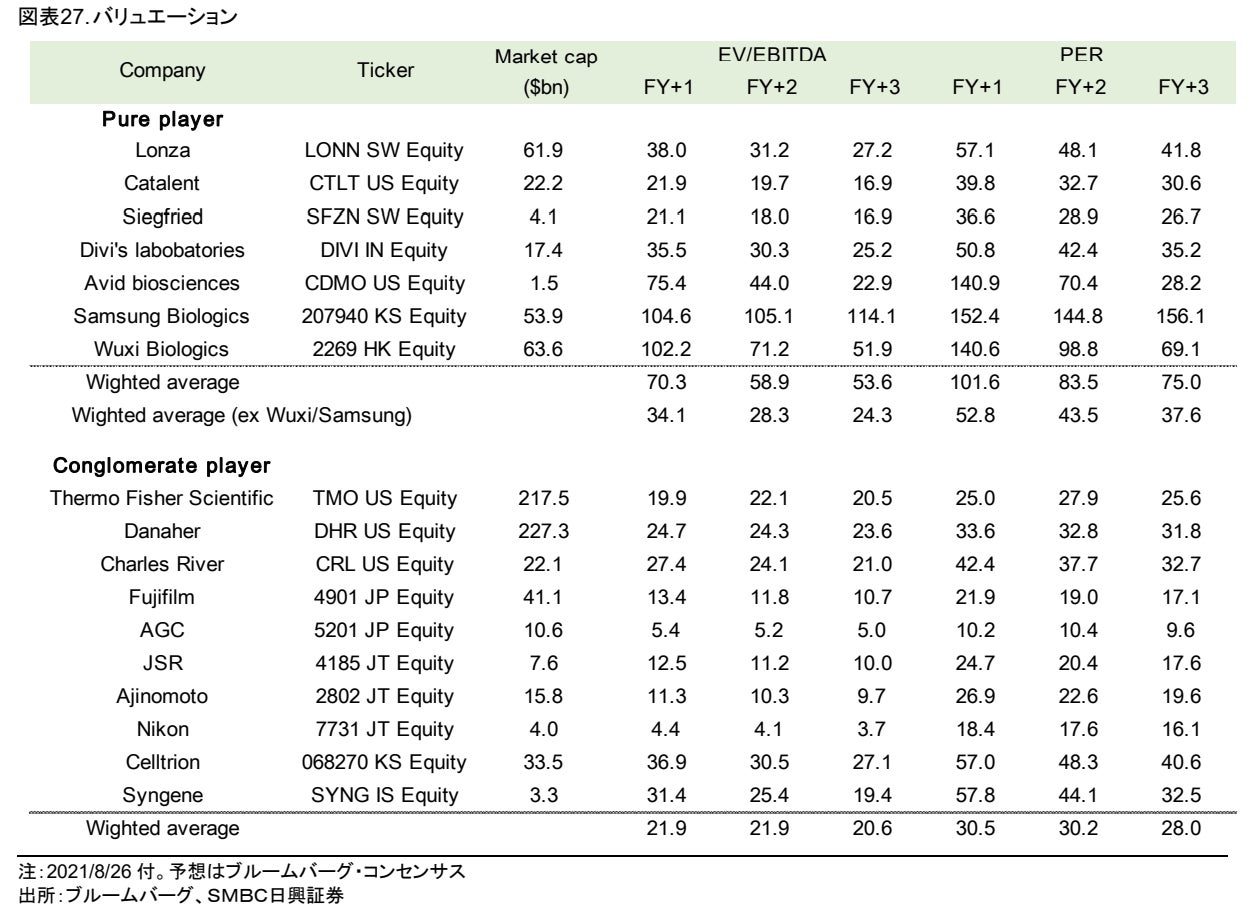たとえば、SMBC日興証券のレポート(https://researchdirect.smbcnikko.co.jp/pdf/front_pdf_download.php?reportid=184658-1&u=20978)によれば、上場CDMO企業の株価パフォーマンスは極めて高く推移し、特に、アジアのpure CDMO企業への評価が高く(EV/EBITDAでx100以上水準)推移しています。