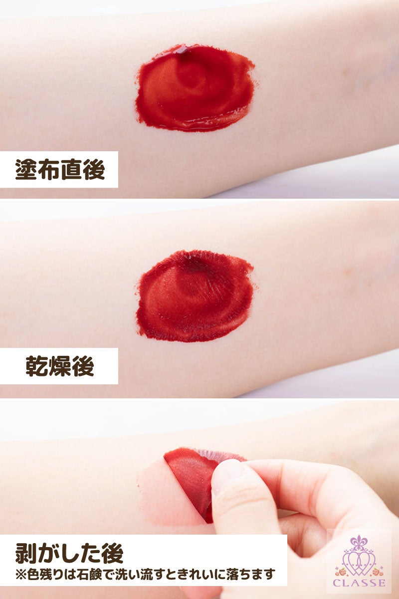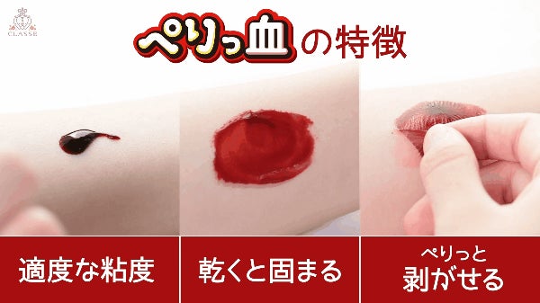 ”コスプレ総合専門店”としてウィッグやカラコン、コスメ、衣装などを広く手掛ける株式会社クラッセ(https://classe.jp / 兵庫県姫路市)は、『乾かしてはがせる肌用血のり ぺりっ血』を発売いたしました。