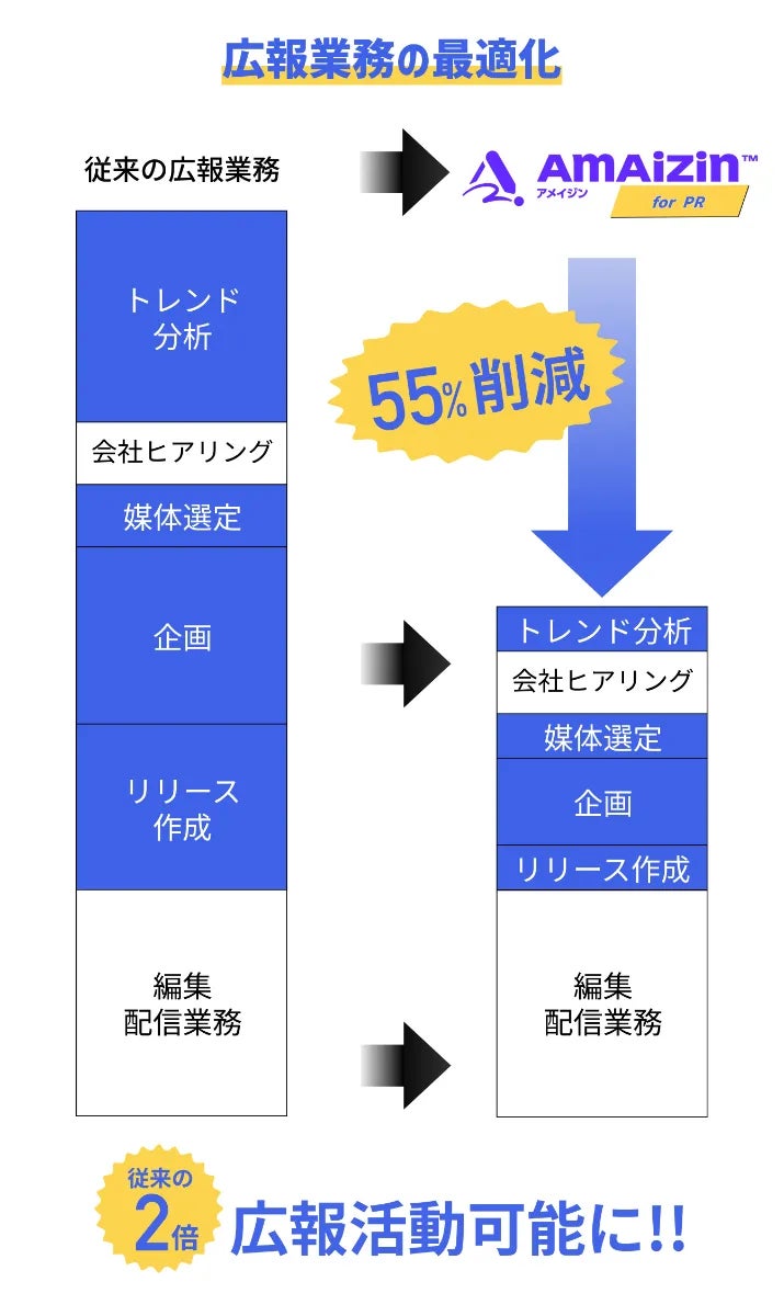 元記者の構成ノウハウを活かしたテンプレートとAIの自動執筆によって、リリースを最適化。手作業でのリリース制作と比べて大幅に時間を短縮し、従来の2倍以上の広報活動を可能にします。