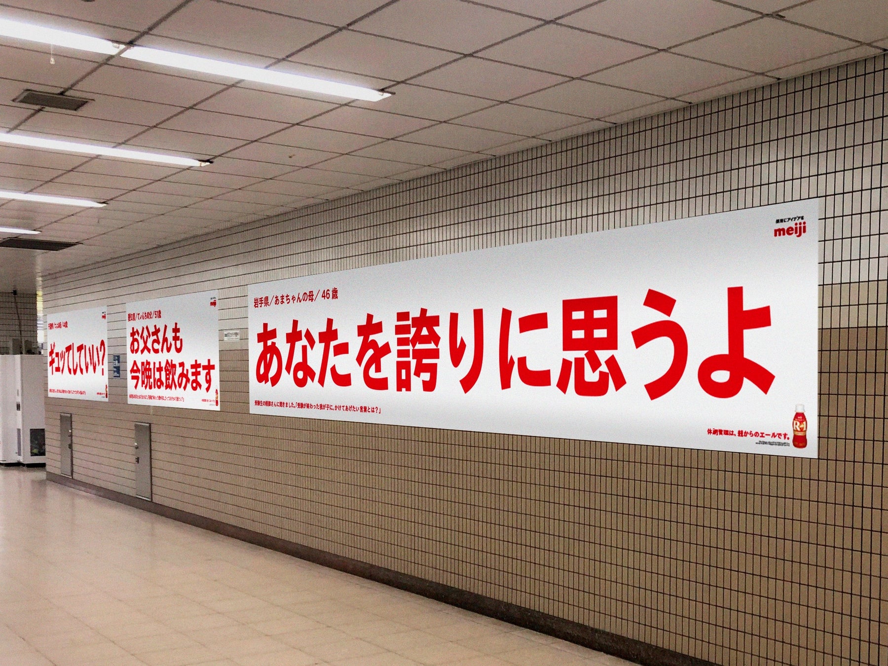 南北線東大前駅の広告の一部には見る角度によって全く異なるデザインへ切り替わるベローズプリントを採用、また京王井の頭線駒場東大前駅では階段広告を使うことで、”親御さんの溢れる愛=伝えきれない想い”を少しでも多く届ける、試験会場に向かう際と試験後に帰宅する際で見えるメッセージが変わる仕掛けになっています。行きには「まあ気楽にやったらええけん」などのような応援の言葉が、帰りには「今夜は焼肉よ」などのような労いの言葉が現れます。普段は面と向かって言葉にできない親の応援の気持ちが広告という形で受験生に届き、実力を存分に発揮する一助になることを願っています。