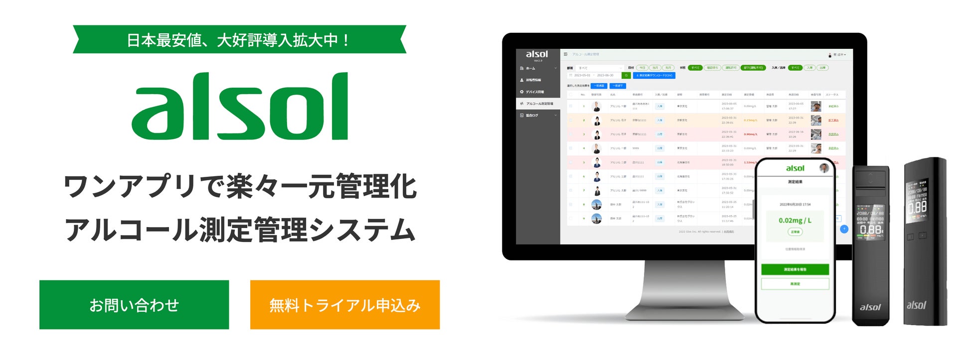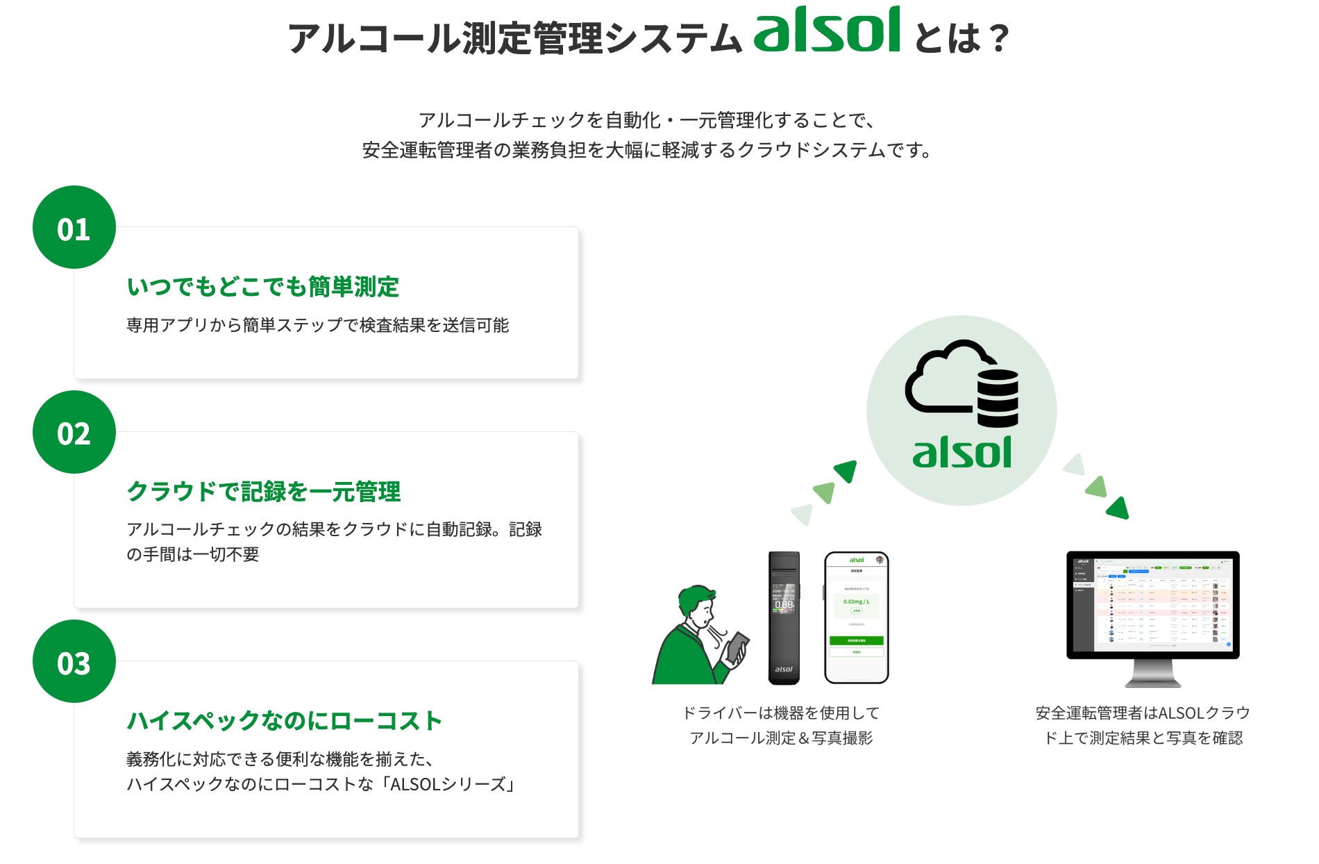 「ALSOL®測定管理システム」は、道路交通法改正による白ナンバー事業者のアルコール検知器義務化に対応しており、アルコール検知器ALSOL®シリーズ(AC002、AC003など)と合わせて、楽々一元管理をご利用頂けます。