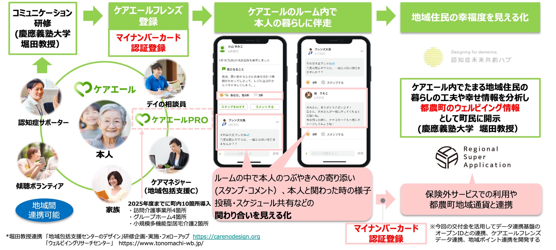 「ケアエール」の活用と「ケアエールフレンズ」の仕組みの構築にあたり、慶應義塾大学健康マネジメント研究科堀田聰子教授に「ケアエール」上で蓄積されていくデータを基にした町民のウェルビーイング分析と「ケアエールフレンズ」養成の為のコミュニケーション研修の実施を委託します。