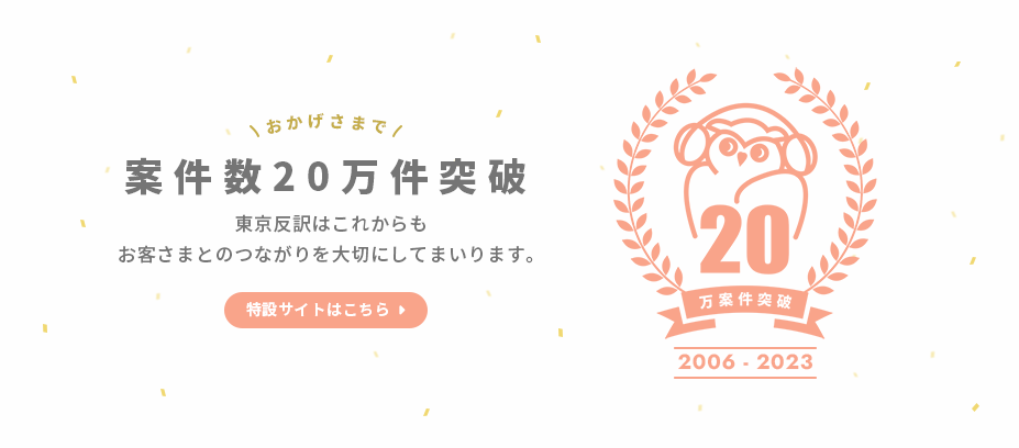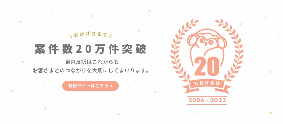 当社は「文字起こし」業界において、一般企業および大学のお客さまを中心に1件ずつ受注を重ね17年間で20万件という受注数を達成いたしました。当社サービスの特長である「品質」と「セキュリティ」を大切にし、数多くのお客さまよりご信頼をいただき繰り返しご注文をいただいたことで実現した実績と考えております。日頃のお客さまのご愛顧といただきました信頼に対し、心より厚く御礼を申し上げます。