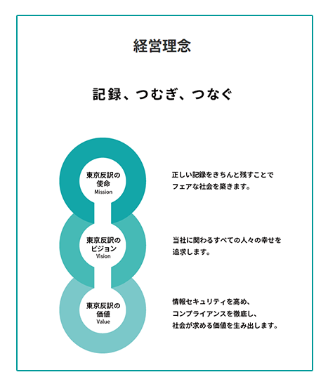 東京反訳は今後もお客さまのご期待に沿うべく、IT技術を活用し高いセキュリティを維持するとともに、人手による丁寧な作業、高い品質を実現する仕組みを高め、お客さまのご要望にお答えしてまいります。