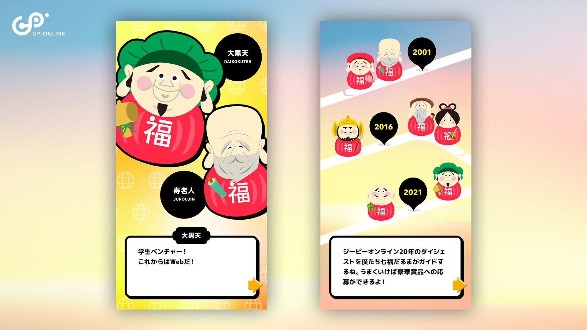 七福だるまと一緒にジーピーオンラインの20年の歩みをゲームで追体験!抽選で7名様に豪華賞品が当たる!