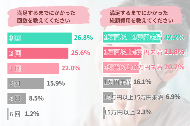 そこで、満足するまでにかかった回数と費用についても調査しました。
