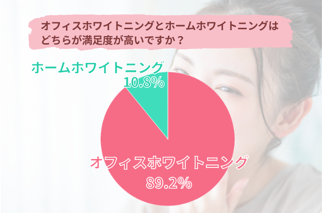 オフィスホワイトニングとホームホワイトニングをどちらも経験した方に、「歯科医院でのオフィスホワイトニングと自宅でのホームホワイトニングはどちらが満足度が高いですか?」と質問したところ、『オフィスホワイトニング(89.2%)』『ホームホワイトニング(10.8%)』と、約9割の方が「歯科医院でのオフィスホワイトニングの方が満足度が高い」と感じていることが分かりました。