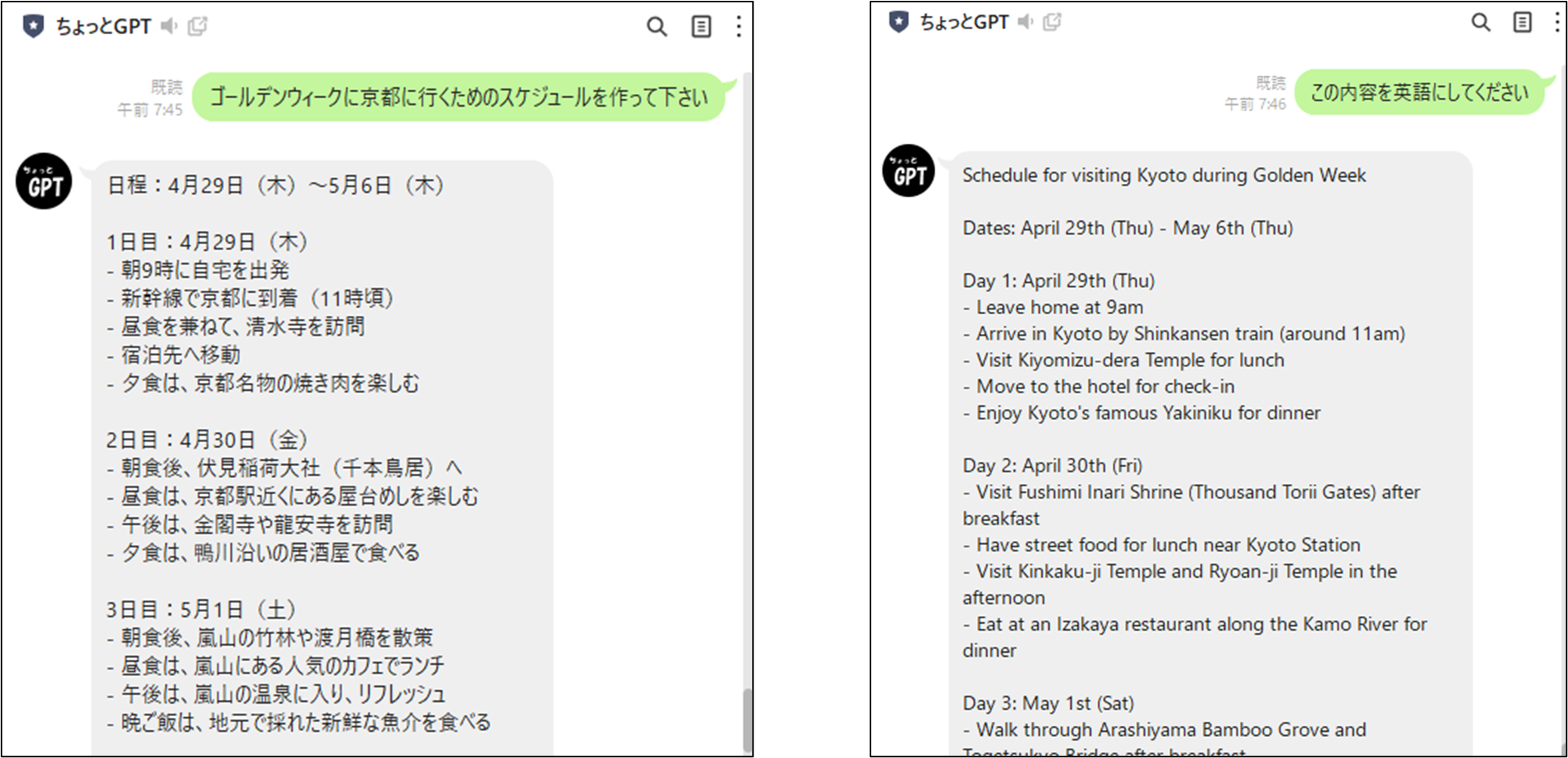 ちょっとGPTは、独自のプロンプトエンジニアリングにより、ChatGPTで会話の前後関係を理解して、対応します。例えば、旅行のプランを日本語で作って、「この文章を英語にして」と依頼するだけで、英語にしてくれます。翻訳ツールなどを使わずに、LINEの操作だけで海外の友人に情報を送ることもできます。今後も独自のプロンプトエンジニアリング技術を活用し、更なる使い勝手の良いサービスを展開していきます。