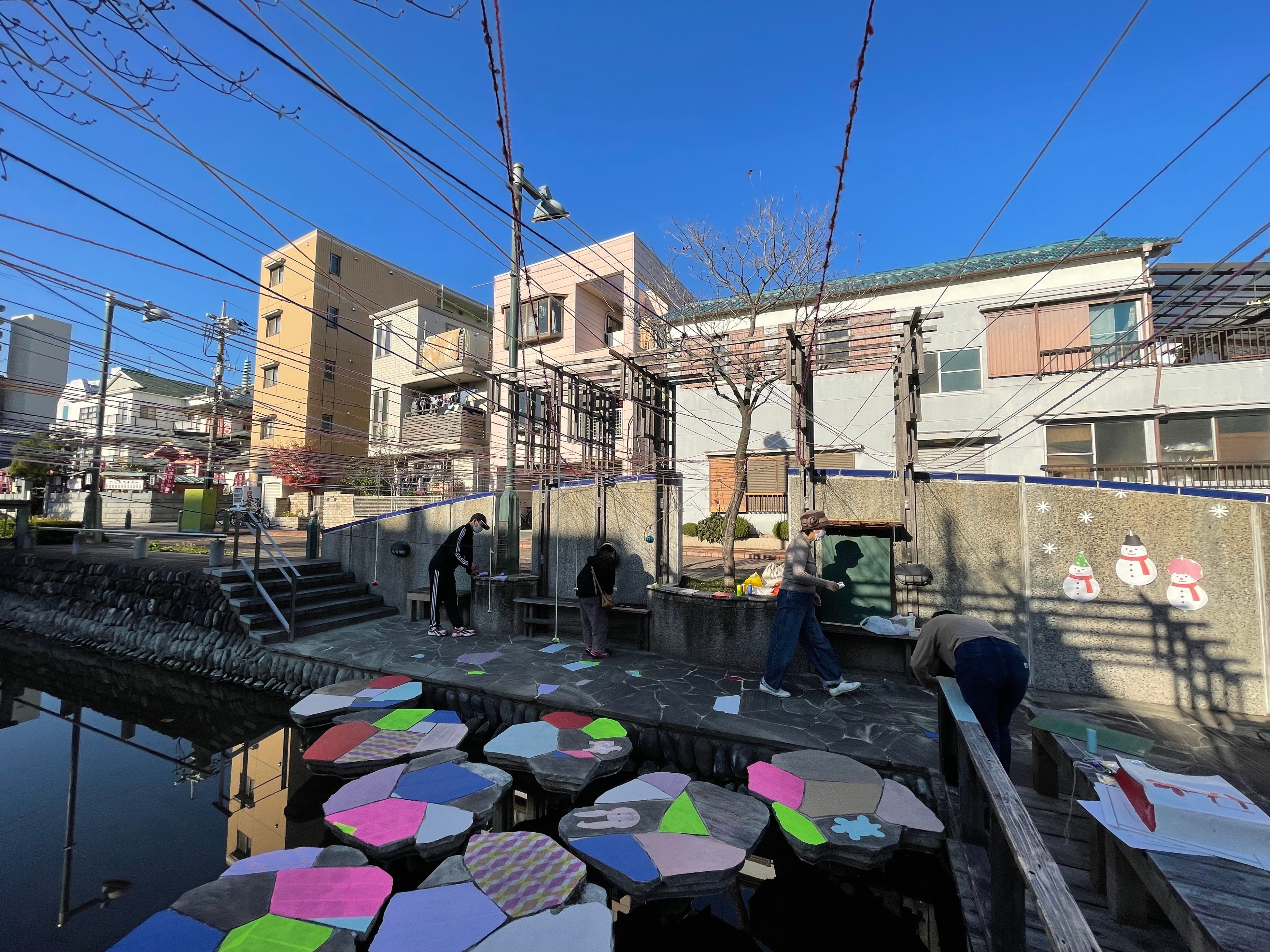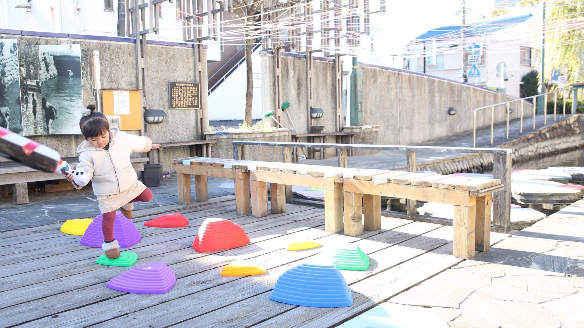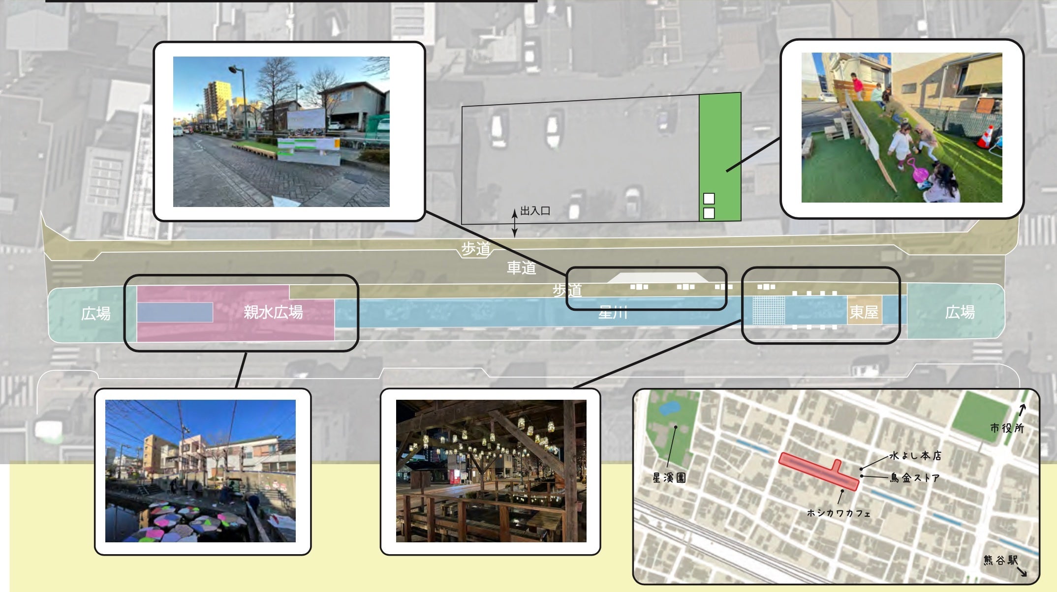 星川の親水広場、東屋、隣接する民地をエリアとして、滞留を促すために子供向けの遊具空間と自由に移動できる折り畳みの椅子とテーブルを用意し、子育て世代を中心として活用してもらう工夫を作っております。
