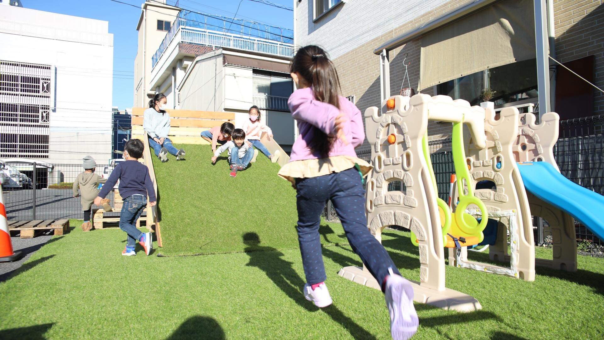 人工芝の滑り台やカラフルな飛び石、落書き掲示板、イルミネーション。子供を遊ばせながらママたちが一息つける、そんなスペースを街にもう一度作っていけないか?