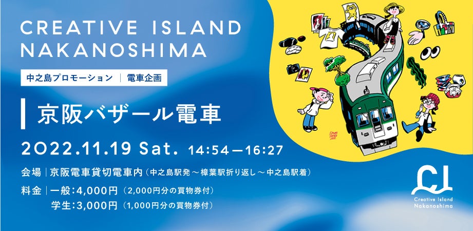 中之島駅から発車する京阪電車を舞台にさまざまなプロジェクトを展開する「電車企画」。“京阪バザール電車”は、走行する電車を街の通りに見立て、アーティストをはじめ様々な人・モノ・コトが出店する特別電車です。ぜひご乗車のうえ、アーティストグッズやスイーツ、ZINEのワークショップなど、様々なモノやコトのお買い物をお楽しみください。