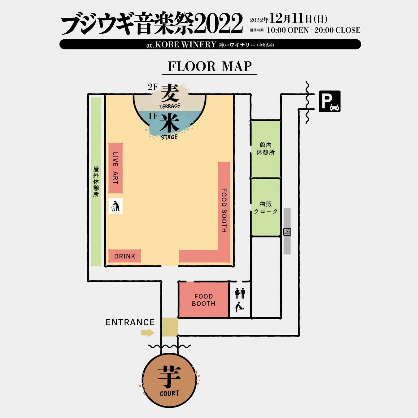 中央広場1階の「米STAGE」/中央広場2階の「麦TERRACE」/BBQ場を利用した「芋COURT」の3ステージでブジウギが楽しめます♪