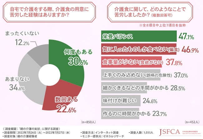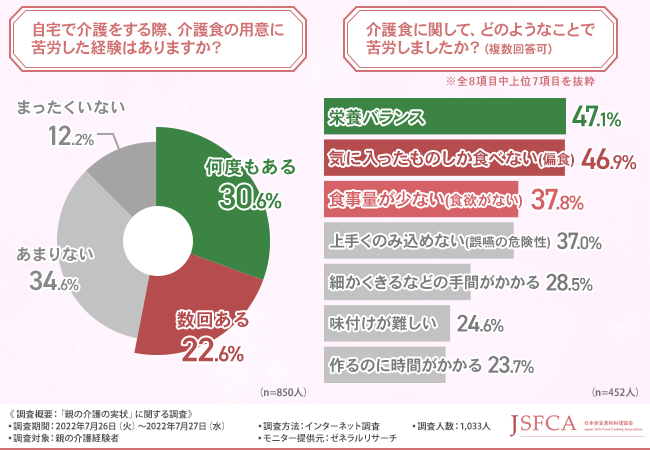そこで、「自宅で介護をする際、介護食の用意に苦労した経験はありますか?」と質問したところ、半数以上の方が『何度もある(30.6%)』『数回ある(22.6%)』と回答しました。