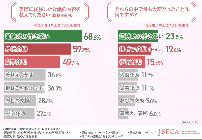 そこで、「実際に経験した介護の内容を教えてください(複数回答可)」と質問したところ、『通院時の付き添い(68.6%)』と回答した方が最も多く、次いで『歩行介助(59.2%)』『食事介助(49.7%)』と続きました。