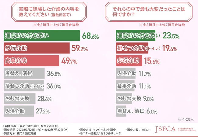 さらに、「それらの中で最も大変だったことは何ですか?」と質問したところ、『通院時の付き添い(23.5%)』と回答した方が最も多く、次いで『排せつ介助(トイレ)(19.4%)』『歩行介助(15.6%)』と続きました。
