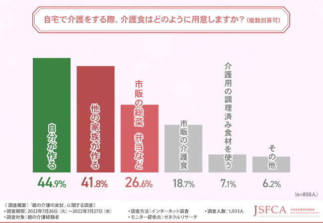 「自宅で介護をする際、介護食はどのように用意しますか?(複数回答可)」と質問したところ、『自分が作る(44.9%)』と回答した方が最も多く、次いで『他の家族が作る(41.8%)』『市販の惣菜、弁当など(26.6%)』と続きました。