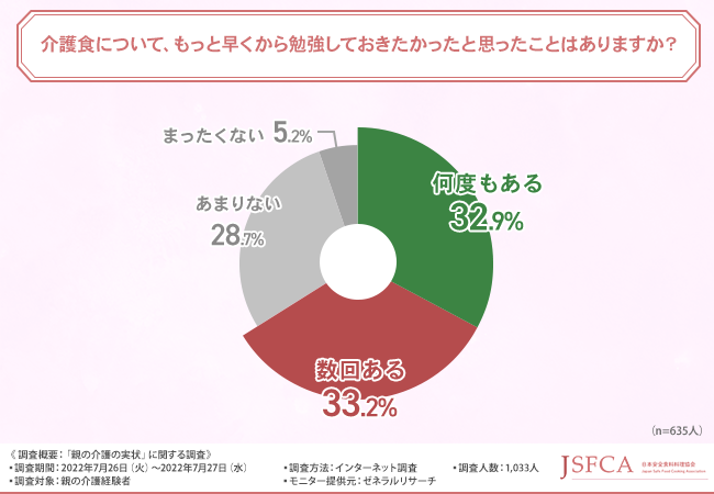そこで、「介護食について、もっと早くから勉強しておきたかったと思ったことはありますか?」と質問したところ、6割以上の方が『何度もある(32.9%)』『数回ある(33.2%)』と回答しました。