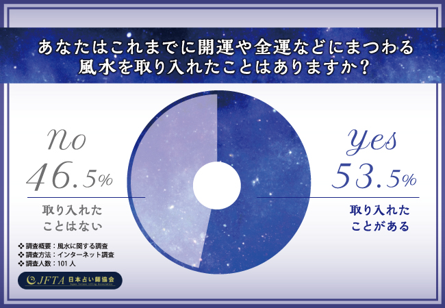 53.5%という半数以上の方が、これまでに何らかの風水を取り入れたことが分かりました。