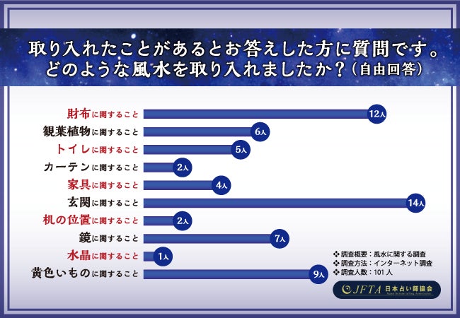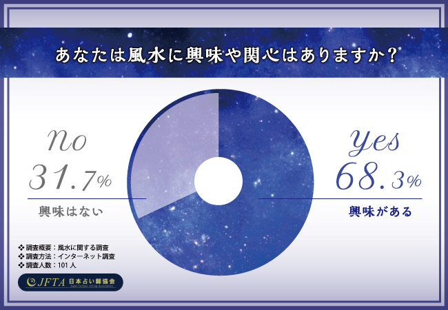 JFTA日本占い師協会(https://www.uranai.org/ )は、日本全国の男女101名を対象に、風水についての意識調査を実施しました。