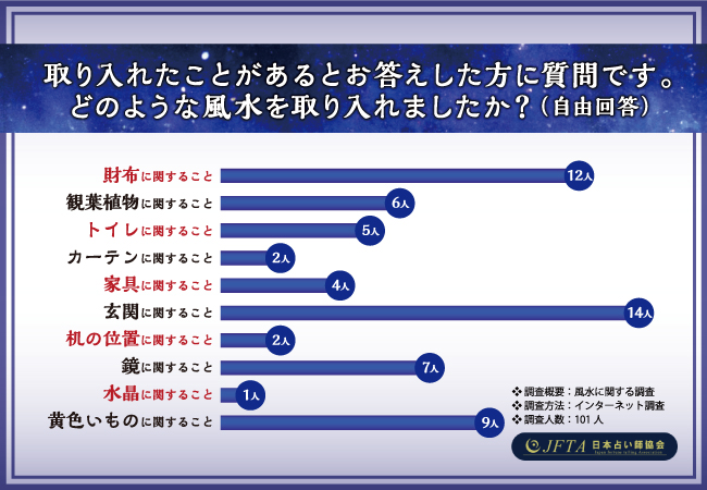 そこで、風水を取り入れたことがある方を対象に「どのような風水を取り入れましたか?」と質問したところ、