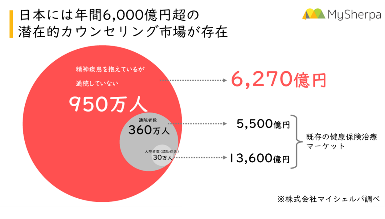 日本の人口の1割強に相当する約1,350万人が潜在的にメンタルヘルス不調を抱えていると推計される中、通院・入院者数は約400万人にとどまっており(認知症を除く)、残りの約950万人もの方々はメンタルヘルス不調を抱えているにもかかわらず健康保険治療ではカバーしきれていない状況にあります。