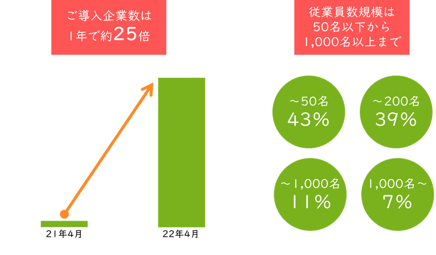 その結果、個人のお客様に加えて、SDGs・健康経営に対する意識が強く従業員の健康を重要視している多くの法人のお客様にもご活用いただいており、ご導入企業数はこの1年間で約25倍と急成長しております。