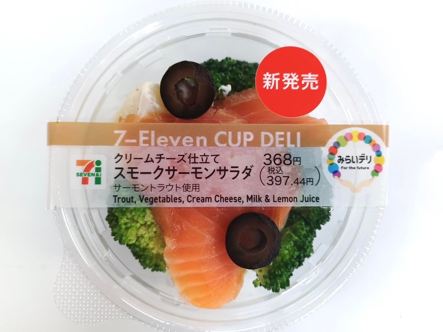 FRDジャパンのおかそだちサーモンを使用した「クリームチーズ仕立てスモークサーモンサラダ」368円(税込397.44円)は、セブン‐イレブンが展開するみらいに向けた商品シリーズ「みらいデリ」として、2023年8月1日(火)より一部エリアのセブン-イレブンにて発売となります。