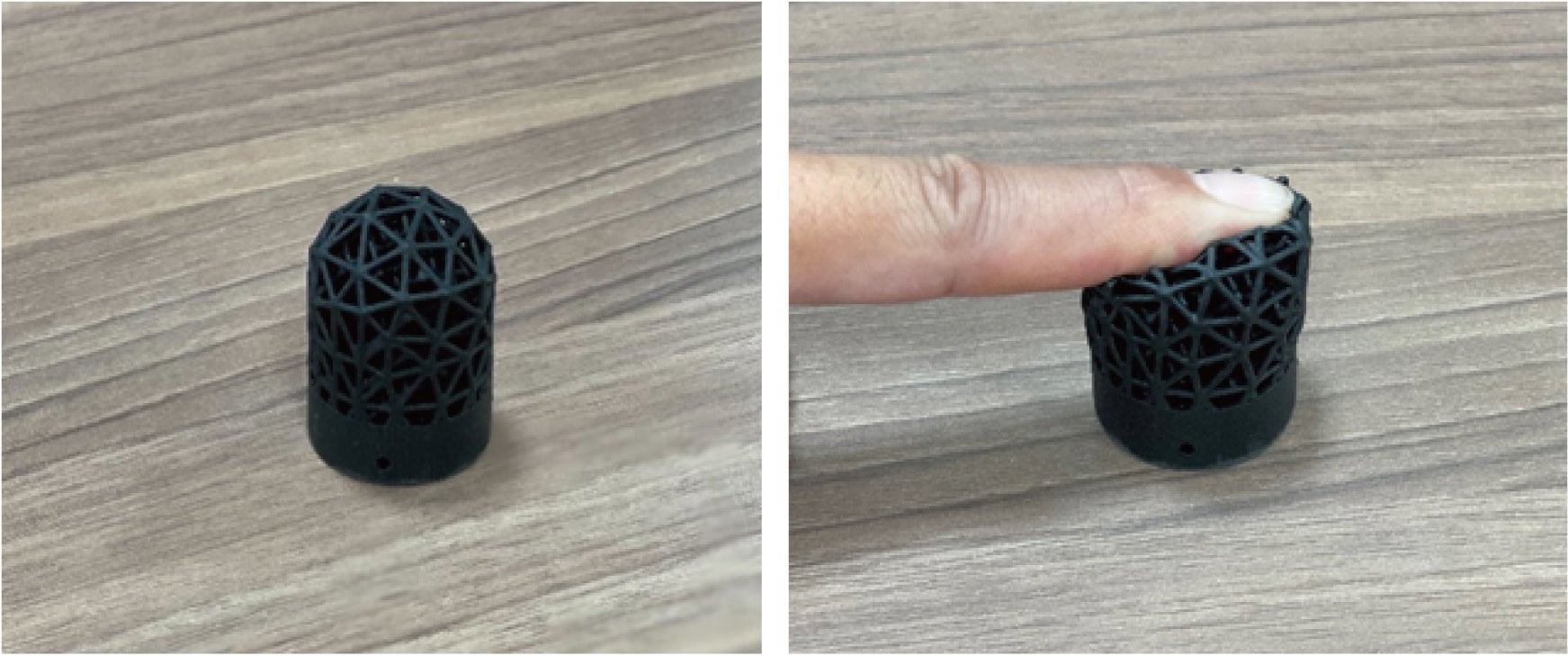 ラティス構造と呼ばれる立体の格子構造で構成されており、3Dプリンタでしか造形できない複雑形状をしています。この構造によって耐久性をそのままに「やわらかさ」を実現し、複雑な対象物の形状にならい安定した把持が可能となります。