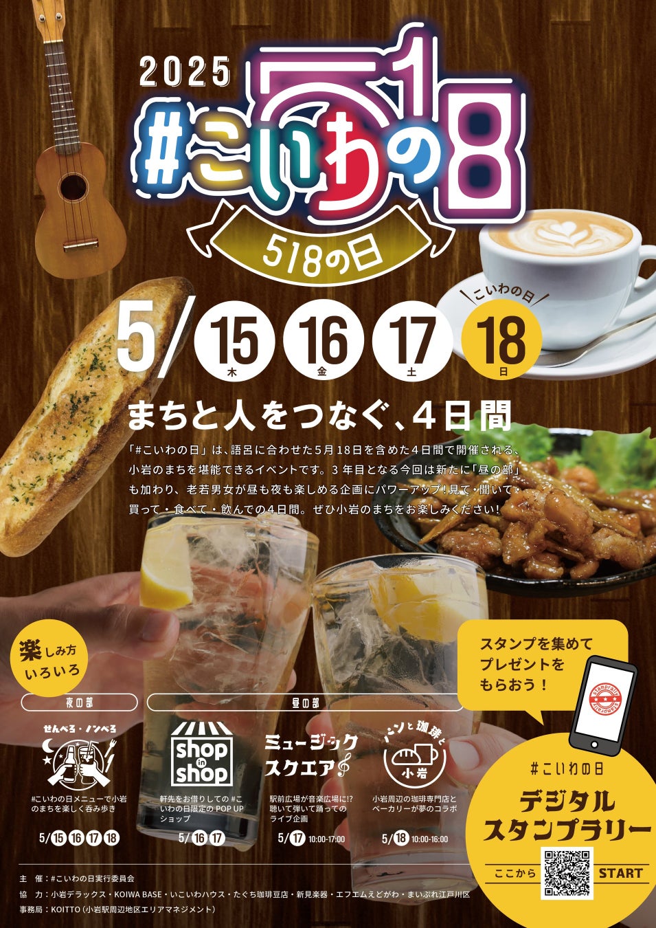 一般社団法人小岩駅周辺地区エリアマネジメント(KOITTO)を中心に構成された#こいわの日実行委員会は、小岩駅周辺地区の再開発に伴う一体的なまちづくりを目指し、JR小岩駅周辺の飲食店や地域団体と協力し企画したイベント「#こいわの日(518の日)」を開催します。期間は2025年5月15日(木)から18日(日)までの4日間です。