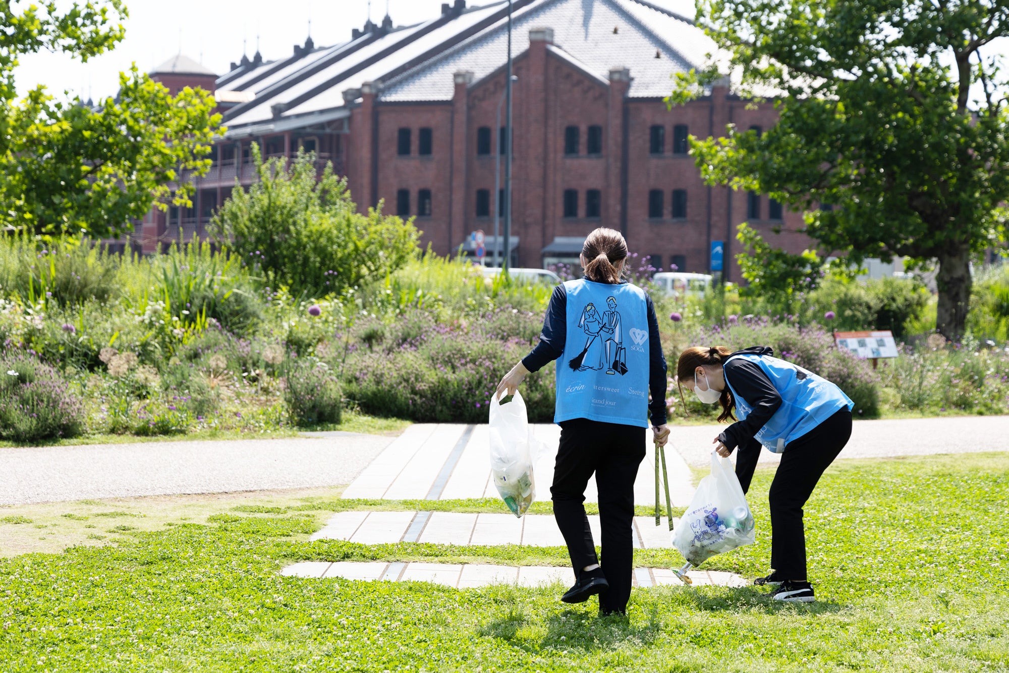 馬車道周辺のオフィス街ではタバコの吸い殻、缶、ペットボトル、飲み掛けの飲料が最も多く、赤レンガ倉庫のある海の方向に向かうと観光地で多くの人が訪れるエリアのためかごみの種類も豊富になり、テイクアウトのお弁当やウイスキーボトル、折れたビニール傘など大きなものも。赤レンガ倉庫そばの新港中央公園では、散歩中の男性から気さくに話しかけていただきました。往復およそ2.5キロメートルの距離、清掃の成果は45リットルの袋2つ分になりました。
