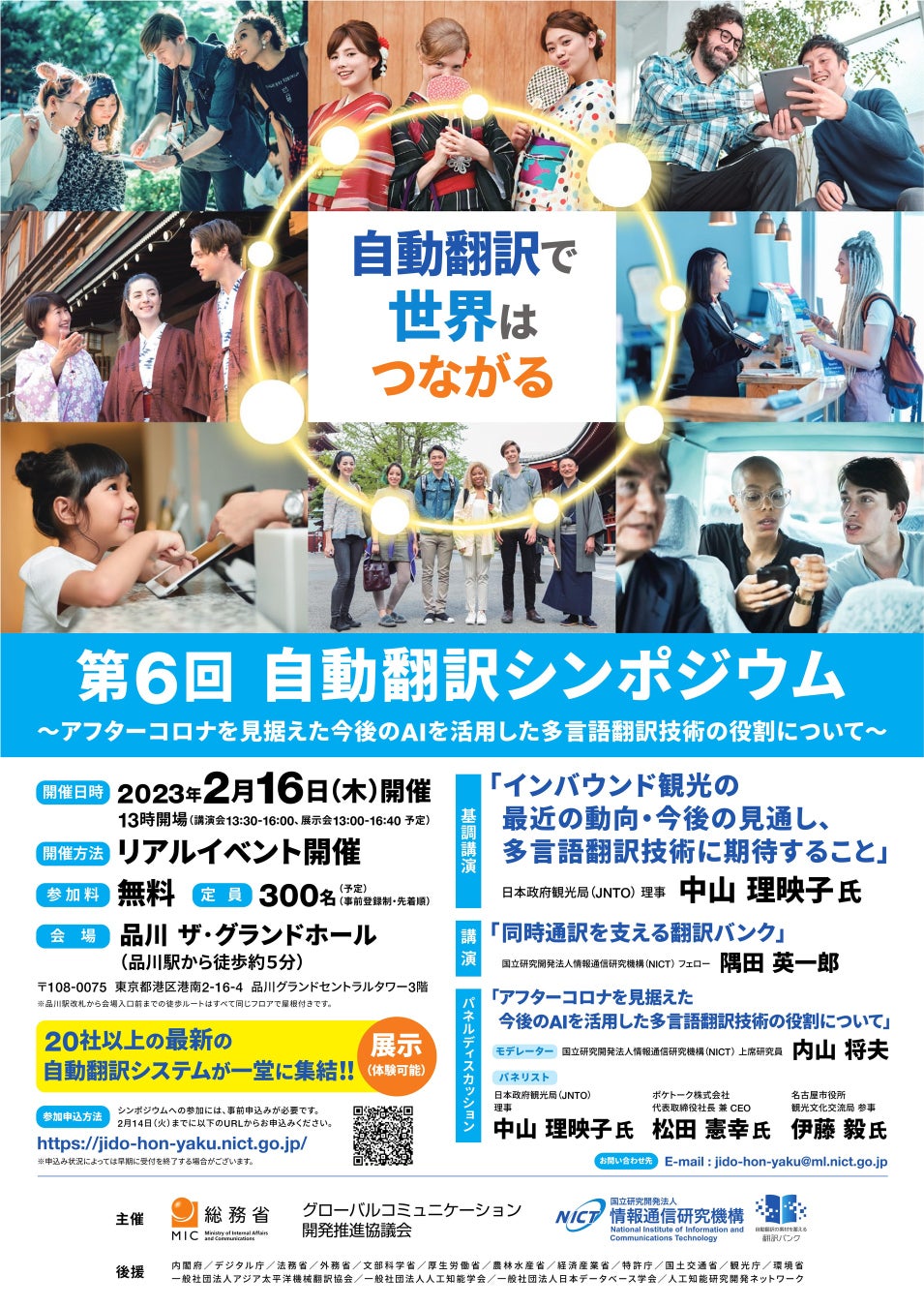 今般、外国人の新規入国制限の見直し等により訪日・在留外国人の増加が見込まれる中、技術水準の向上と実用化が進む多言語翻訳技術について広く発信していくため、「第6回 自動翻訳シンポジウム ~アフターコロナを見据えた今後のAIを活用した多言語翻訳技術の役割について~」を開催いたします。