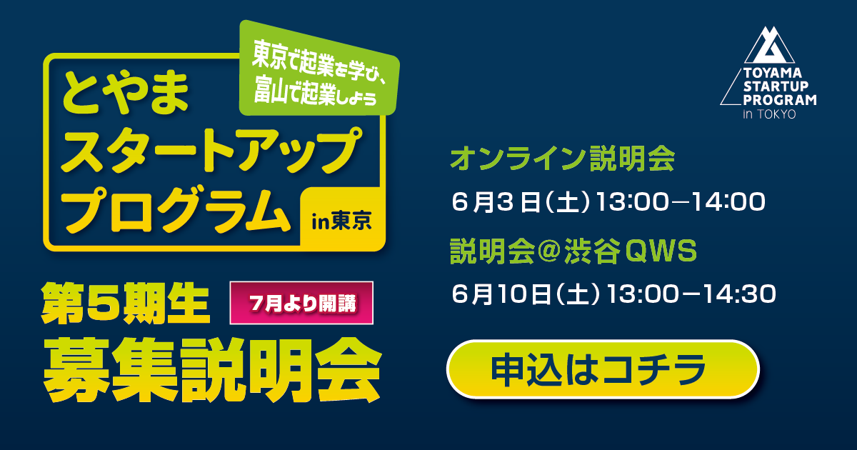 「とやまスタートアッププログラム in 東京」第5期生を募集します。