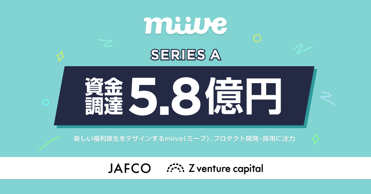 EX(従業員体験)プラットフォーム「miive(ミーブ)」を提供する株式会社miive(本社:東京都渋谷区、代表取締役:栗田 廉)は、この度、昨年春のプレシリーズAラウンド1億円に続き、今回シリーズAラウンドでJAFCO、Z Venture Capitalなどを引受先とした第三者割当増資及び、融資を併せて総額5.8億円の資金調達を実施しました。調達した資金は、主に人材採用、プロダクト拡充に充てる予定です。福利厚生市場×Fintechで、従業員のより良い生活を支え、個人が持つ力を最大限発揮できる「働く」の未来を創造していきます。