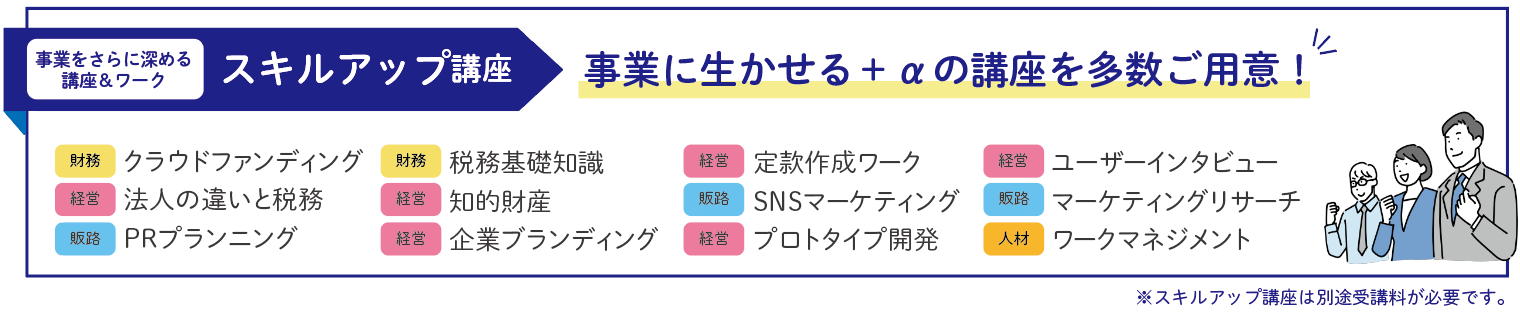 本プログラム講師の多くが自身でビジネスを行っており、アカデミックな理論に加えて実践を想定した講義が主体となる。また対応可能な範囲も広く、個々の状況に合わせた指導を行い、創業や第二創業、会社の新事業部門立ち上げ等の幅広いニーズをカバーすることが可能である。又、講義以外にもコミュニティーマネージャーへの無料相談を行うことができ、起業するための手続きや相談、専門家紹介が可能となる。
