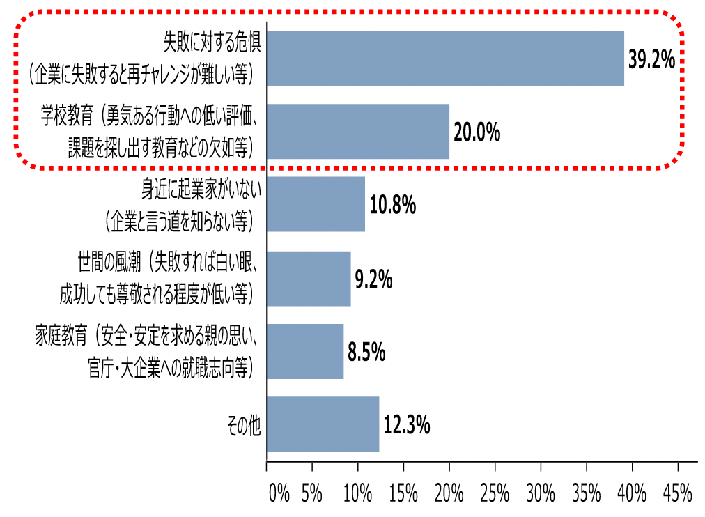 日本で起業家が少ないとされている理由として、図2に示す「失敗に対するリスク的側面」が大部分を占めている。加えて新しいことにチャレンジして成功を掴むことへの評価が低く、そもそも義務教育ではほとんど起業について学ぶ機会は乏しい。近年では大きく義務教育のカリキュラムの変革がなされてきてはいるが、やはりまだまだ起業がしやすい教育環境が整っているとは言い難い。