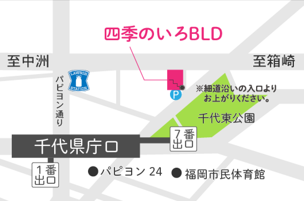 ・電車でお越しの方:地下鉄貝塚線「千代県庁口駅」7番出口より徒歩2分 又は JR「吉塚駅」より徒歩14分